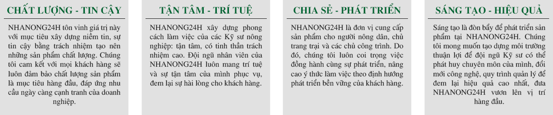 Sự tin tưởng và ủng hộ của khách hàng trong suốt thời gian qua là nguồn động viên to lớn trên bước đường phát triển của NHANONG24H. Tập thể cán bộ công nhân viên của công ty Chúng tôi luôn không ngừng hoàn thiện, phục vụ khách hàng tốt nhất để luôn xứng đáng với niềm tin ấy.Với phương châm “Sản xuất có tâm – phát triển có tầm”, NHANONG24H khẳng định luôn mang tới những sản phẩm tốt nhất tới cho người nông dân và khách hàng. Chúng tôi định hướng “Liên tục cải tiến” để luôn nỗ lực cả về nhân lực, vật lực, xây dựng uy tín thương hiệu, niềm tin với khách hàng với những sản phẩm chúng tôi cung cấp.