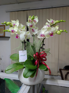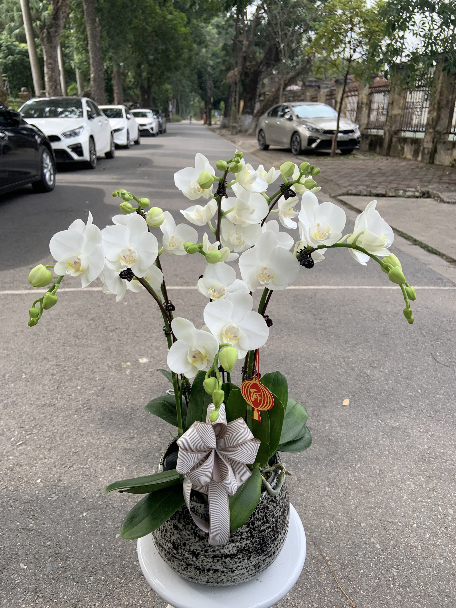 Hình ảnh: Chậu lan hồ điệp trắng ama với các thế cắm khác nhau, màu trắng tinh khôi kết hợp với chậu tối màu đem lại cảm giác sang trọng và làm nổi bật lên màu sắc của hoa
