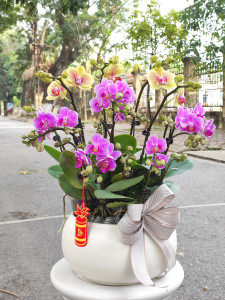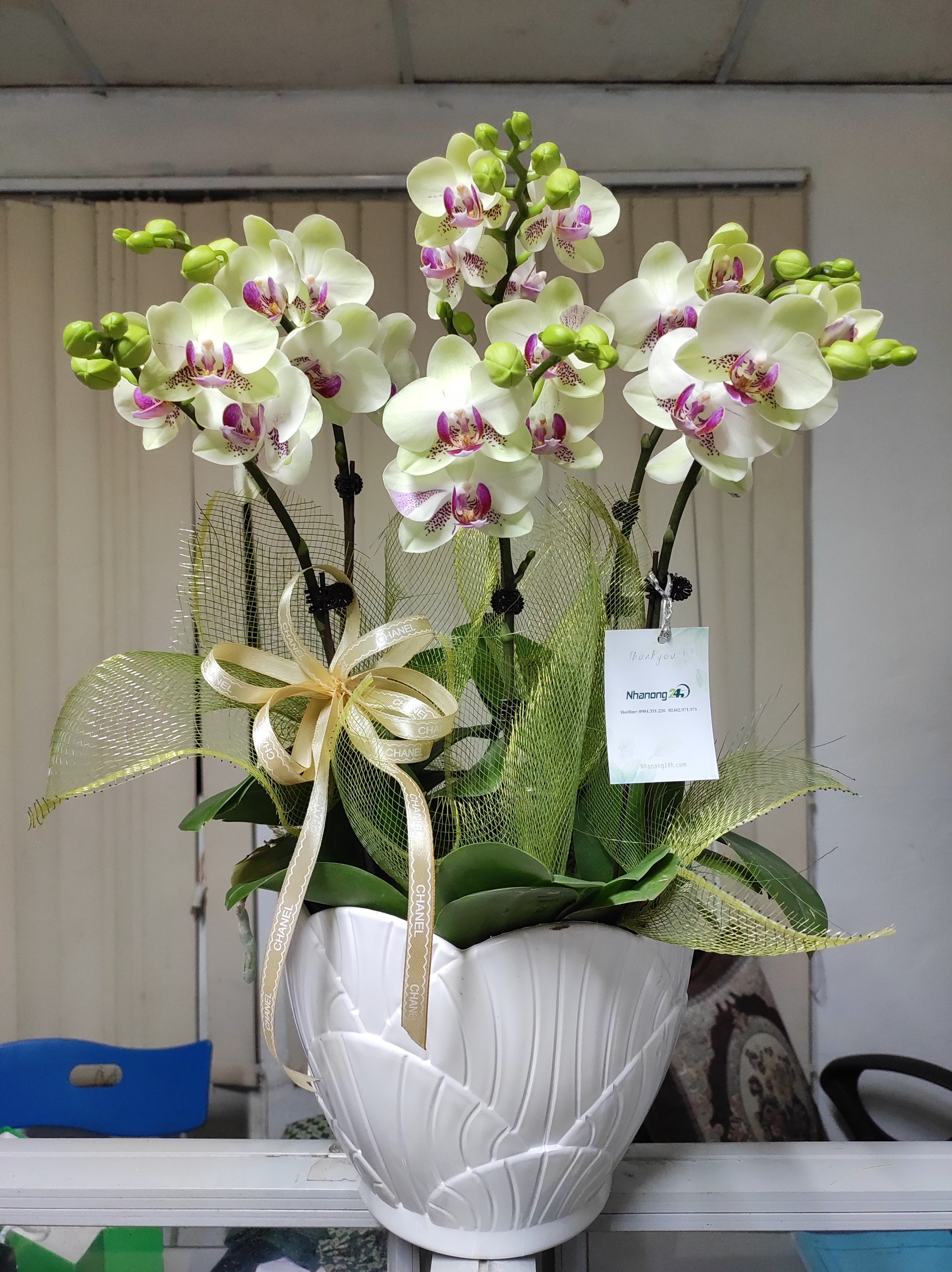 Hình ảnh: Chậu lan hồ điệp Mini Xanh táo với các thế cắm khác nhau từ 5-7 cành