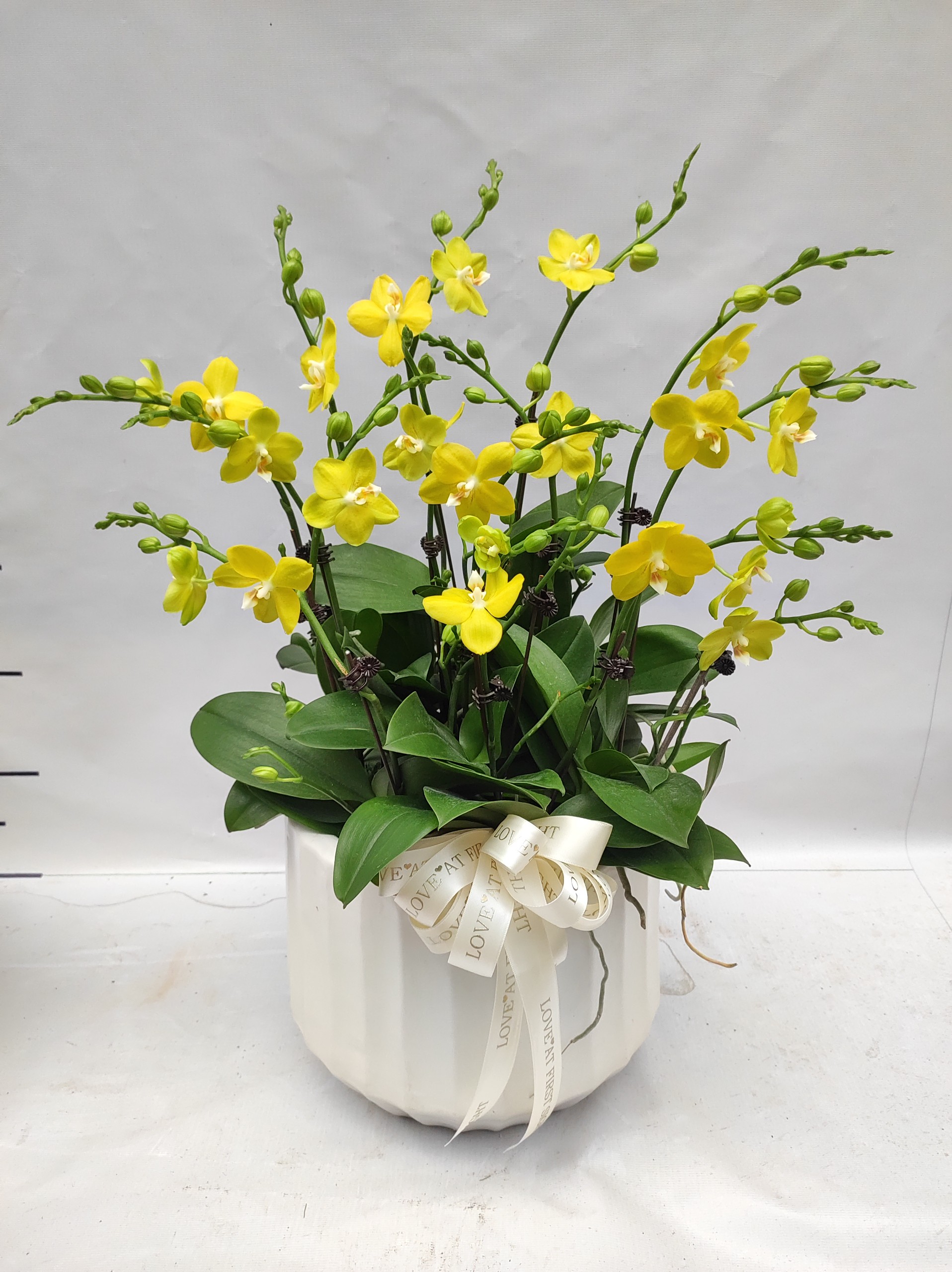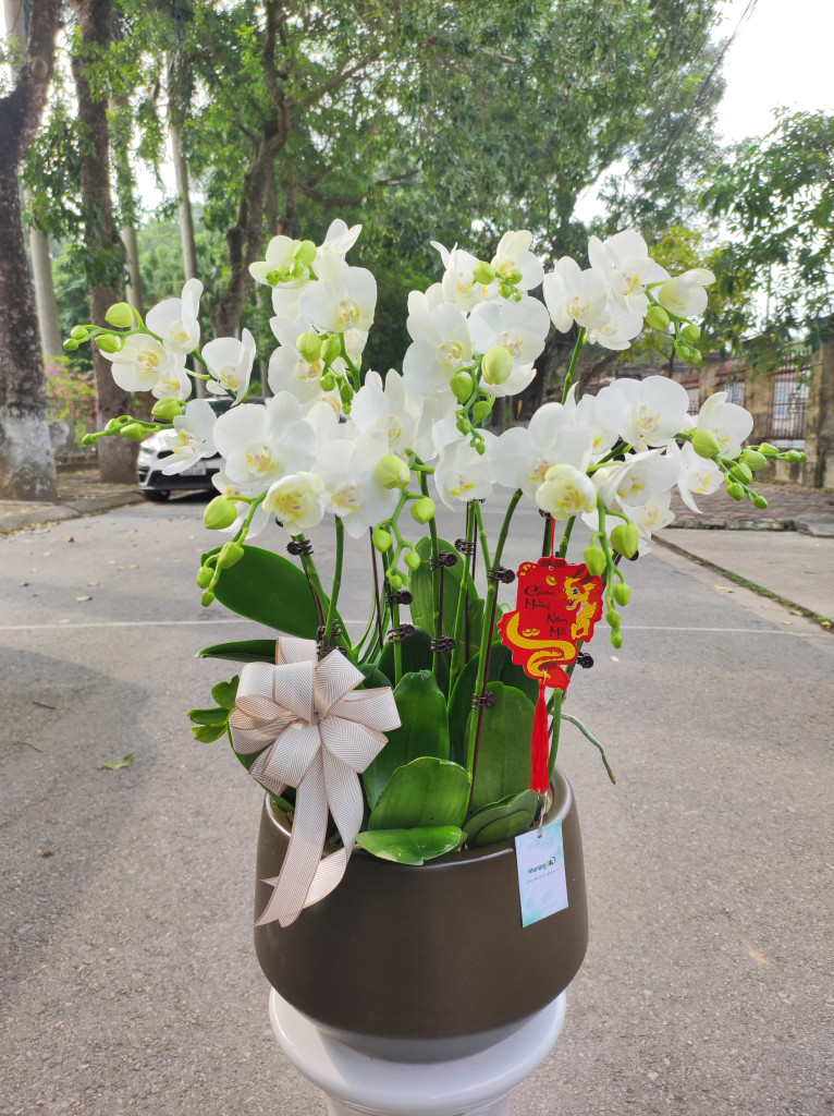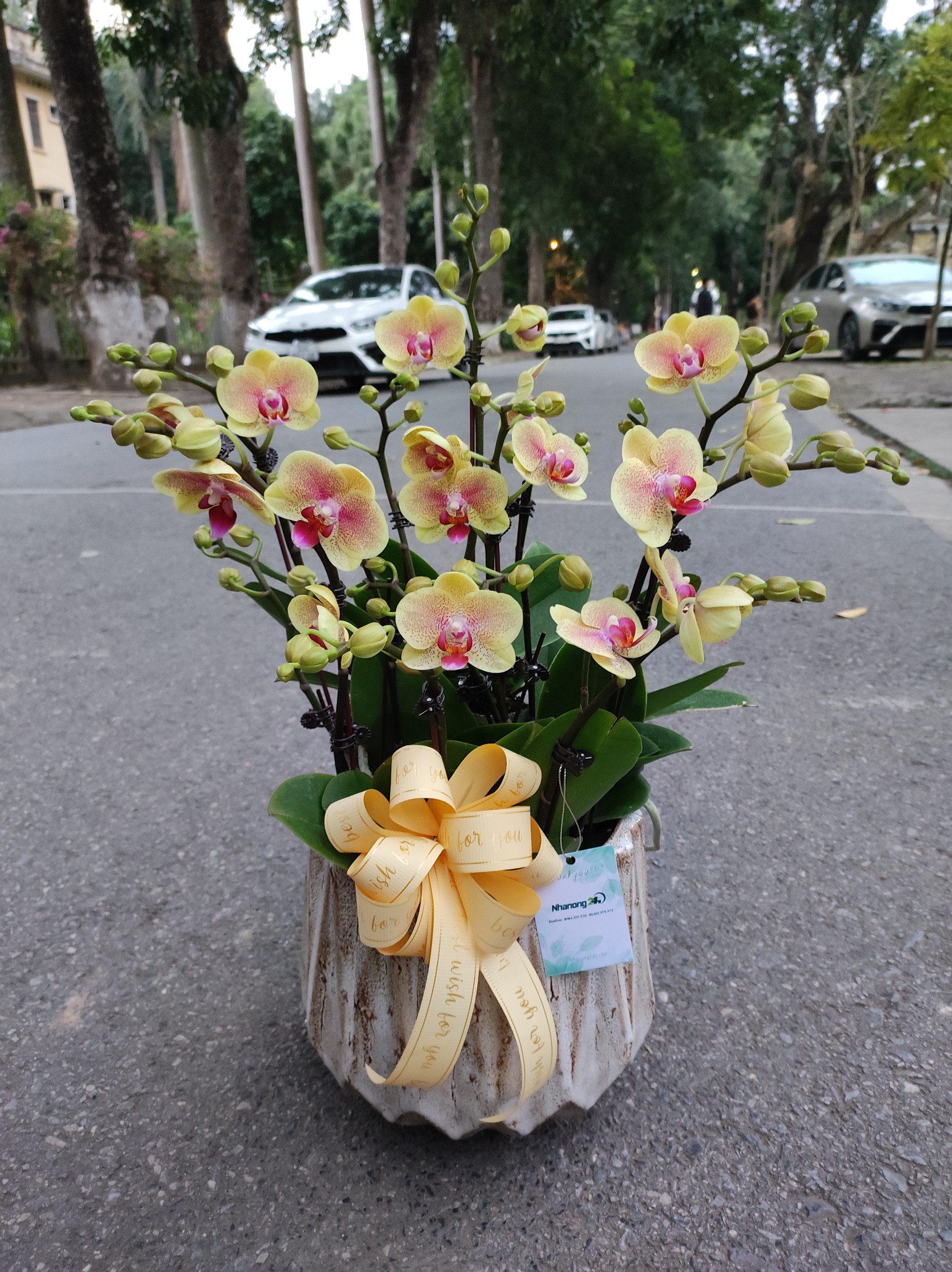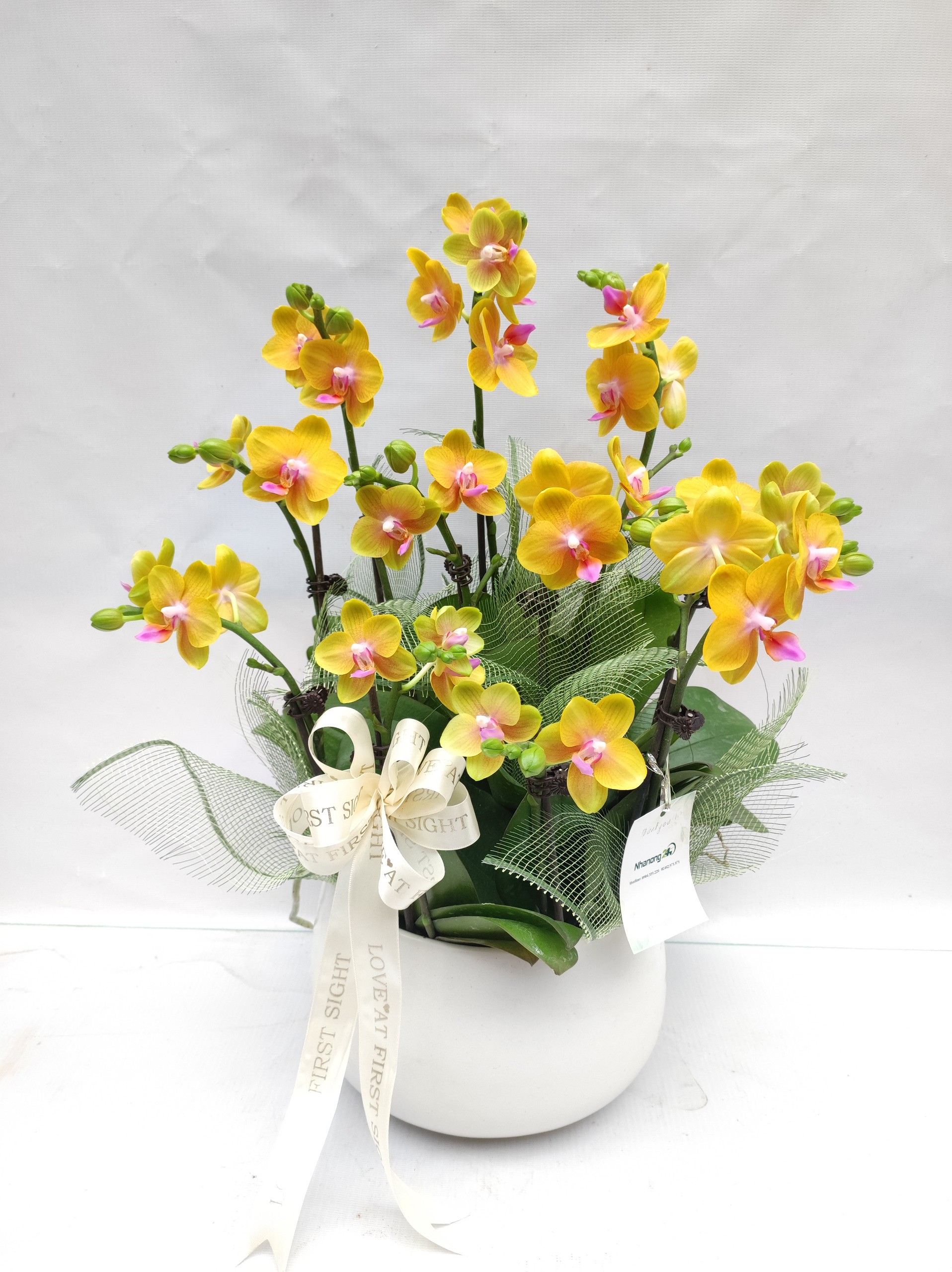 Hình ảnh: Chậu hoa lan hồ điệp với màu sắc vàng là chủ đạo được lên chậu với các dáng khác nhau, Theo quan niệm thì tết đến xuân về mỗi gia đình thường lựa chọn tone vàng với mong muốn đem lại tài lộc và may mắn trong năm mới.