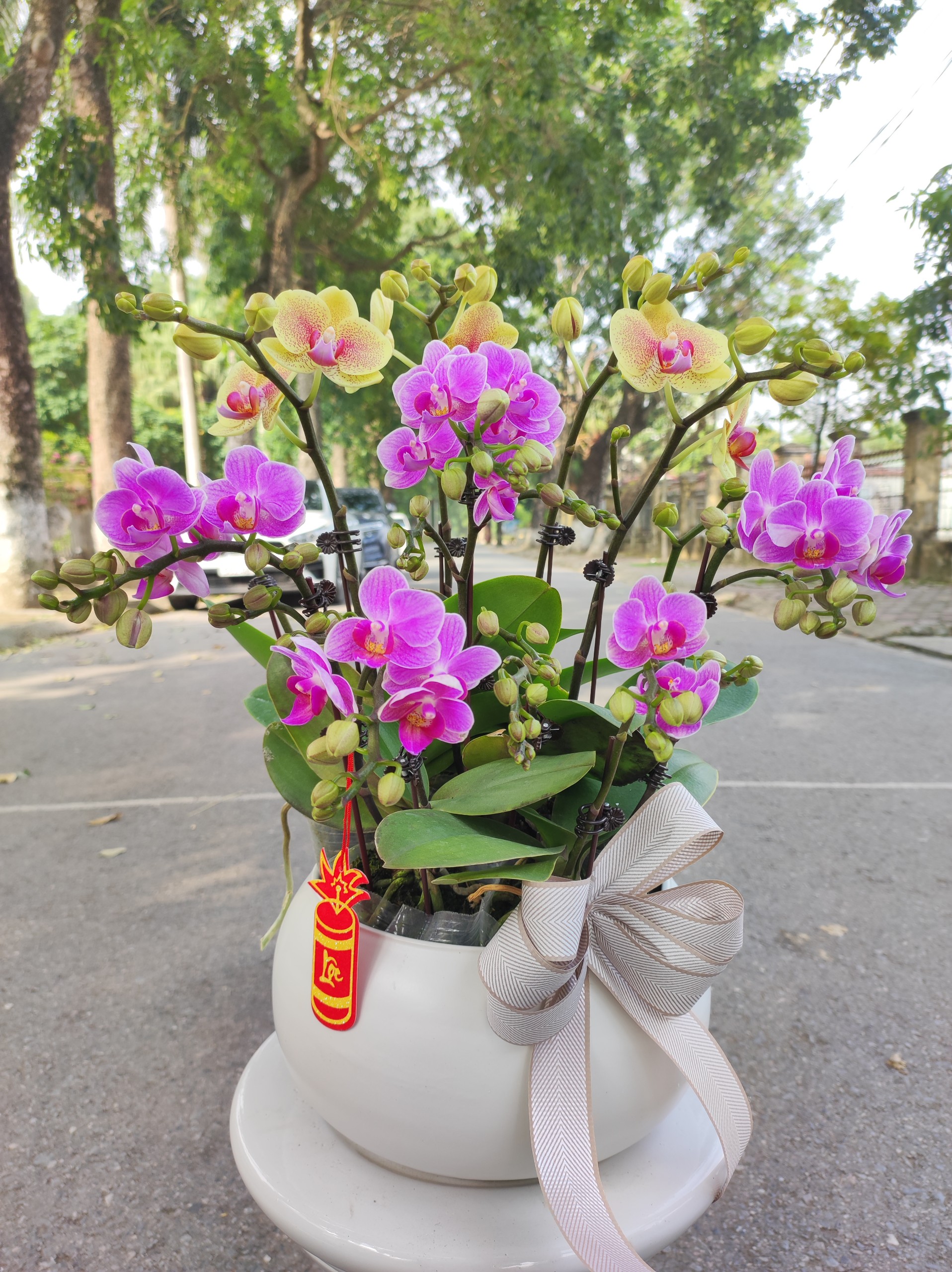 Hình ảnh: Chậu lan hồ điệp mini mix 2 màu hồng và vàng sum xuê nụ, hoa mang ý nghĩa cầu tài lộc đem lại may mắn và dồi dào tiền tài cho gia chủ sở hữu chậu hoa